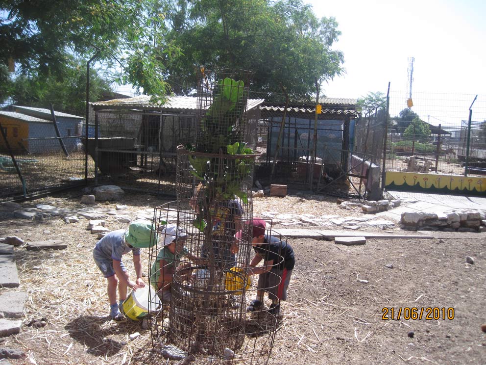 בתמונה 5/6 הילדים עובדים על מיחזור המים ,מנקים את השוקטות ועם המים משקים