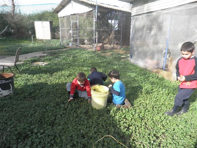 תמונה שנייה - 4 בנים מגן עופר באים פעם בשבוע בצהריים לפעילות במשק. הפעם הם קוטפים חובזות. מימין: עודד שוק