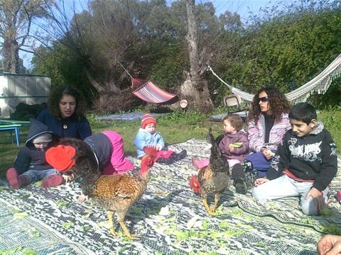 הפעוטות מפעוטון תות מאכילים בלחם ובירק את התרנגולות