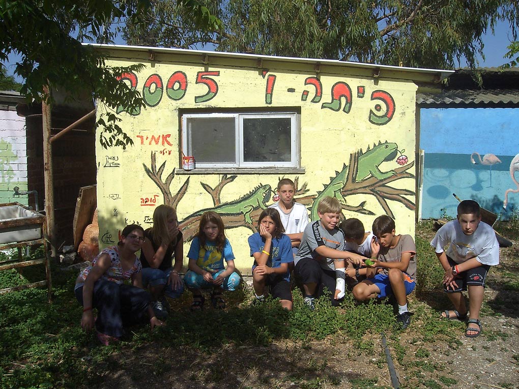 כל הילדים ליד אחד הציורים (אפשר לגלול את התמונה לימין ושמאל כדי לראות את כולם)