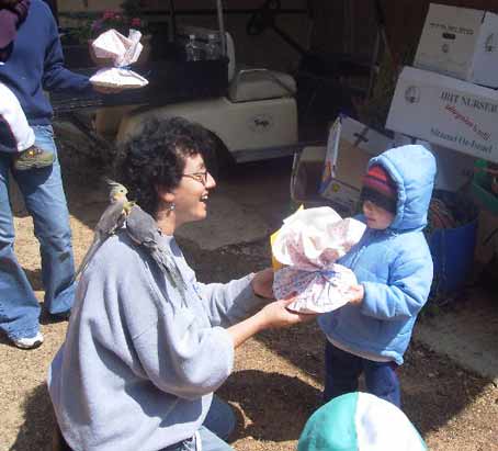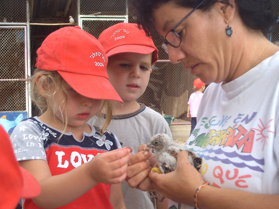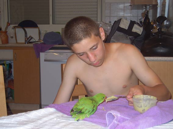 טל מאכיל גוזל של דררה שנפל מקן, הוצא מפה של כלב שתפס אותו, והובא לפינת החי לטיפול. (תוכי דררות, הם תוכים שברחו בעבר משבי, וכיום חיים ומתרבים ברחבי הארץ).