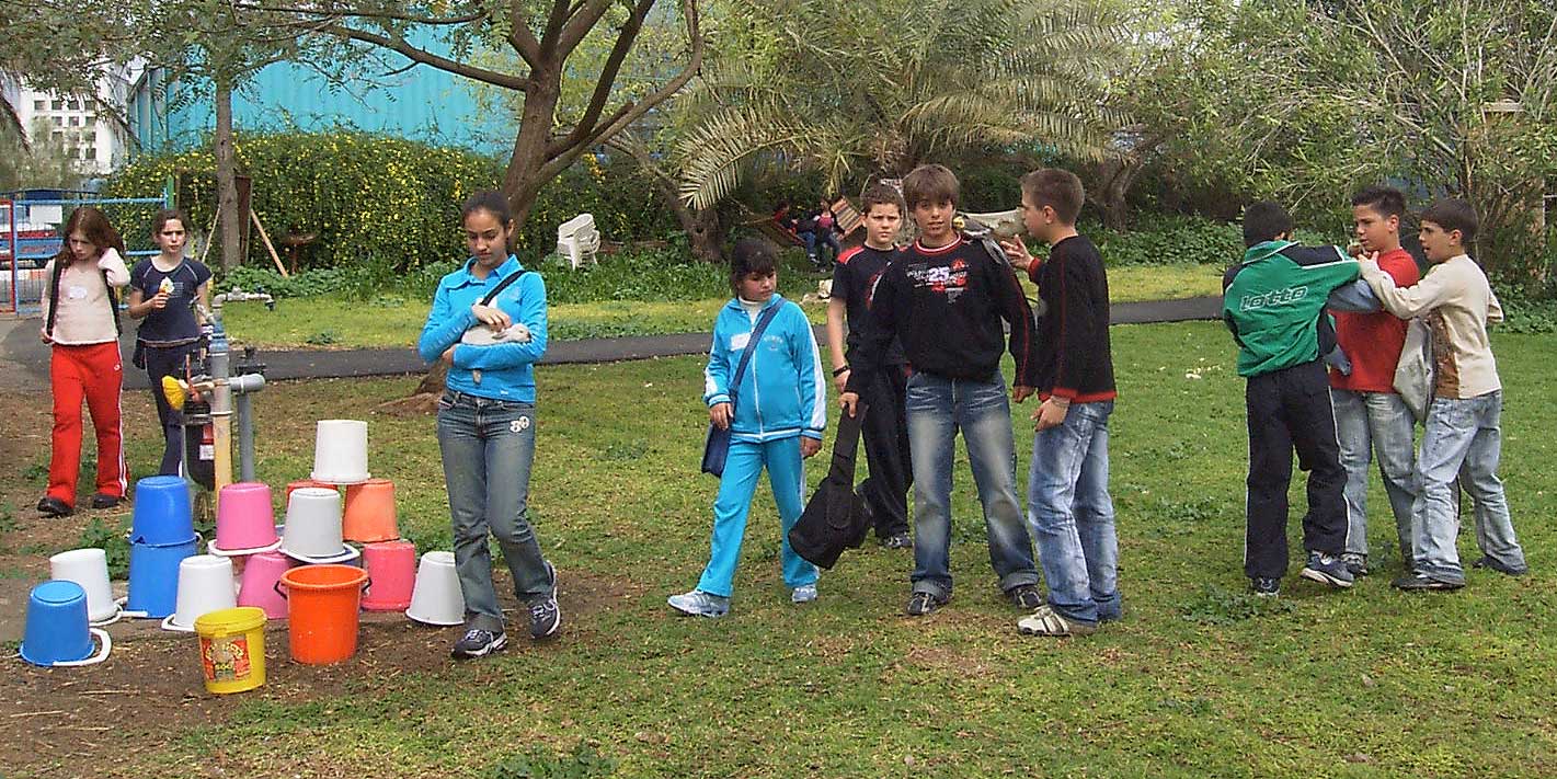 ילדים מבית ספר "רניה" מנצרת ובית ספר "עומרים" באחד ממפגשי הדו-קיום. זו שנה שלישית שנערך המפגש, פעם כאן ופעם שם. (תגללו את המסך כדי לראות את כולם)