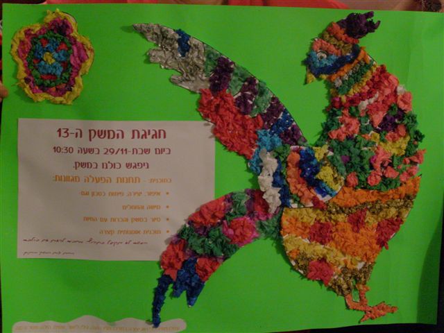 כל חג מתחיל במודעה מושקעת. הכינו חוג יצירה של יונת קציר. המודעה היתה תלויה שבוע קודם בחדר האוכל.