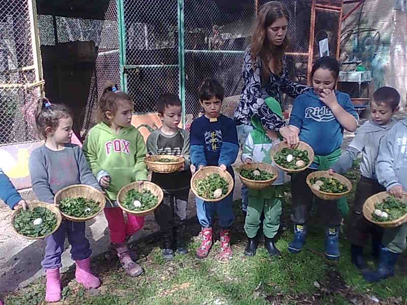9. ילדי גן עופר עם סלים מלאים, מימין: זיו דה-קסטרו, אפיק גזית מיקנעם, דורה הגננת, ילד מיקנעם, יהל קטינא, רות אורם ותמר בריל.