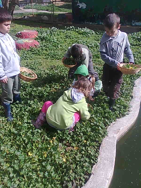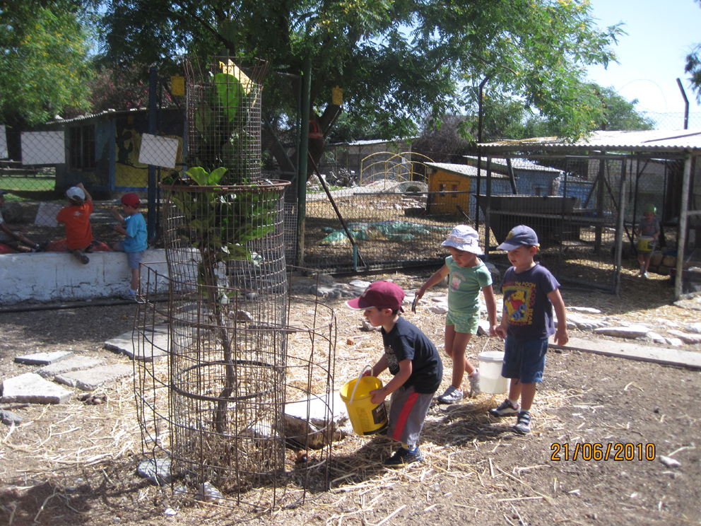 בתמונה 5/6 הילדים עובדים על מיחזור המים ,מנקים את השוקטות ועם המים משקים