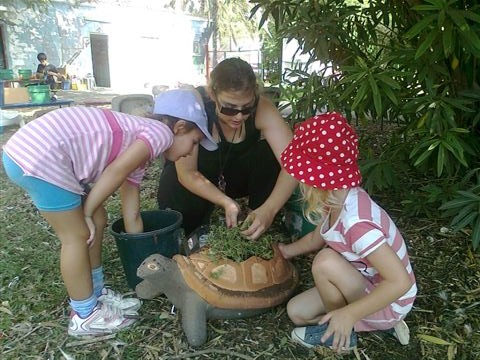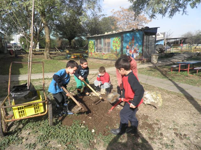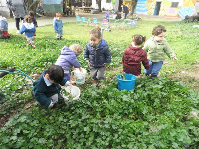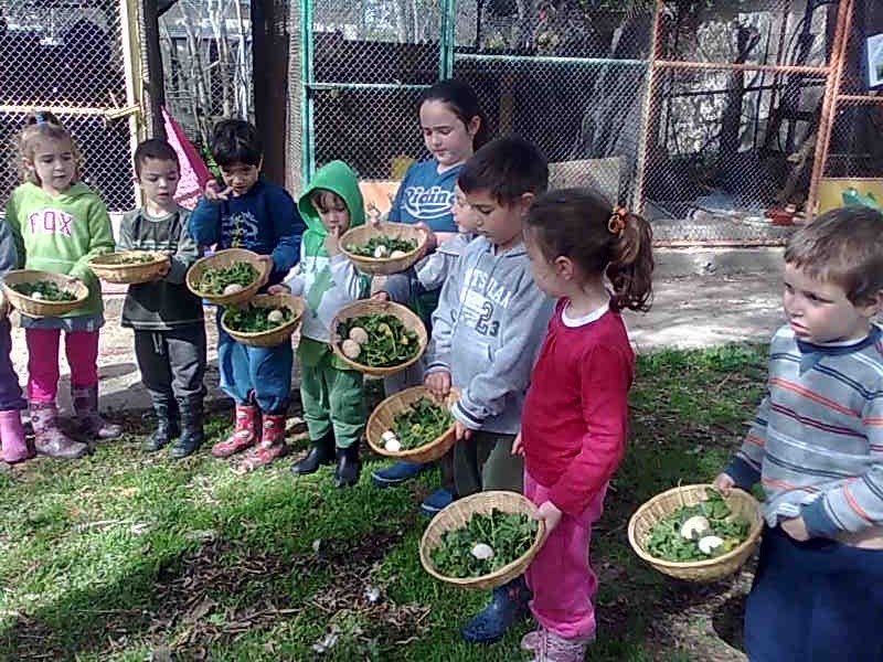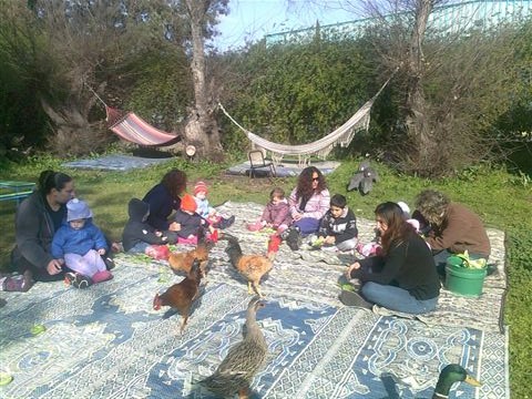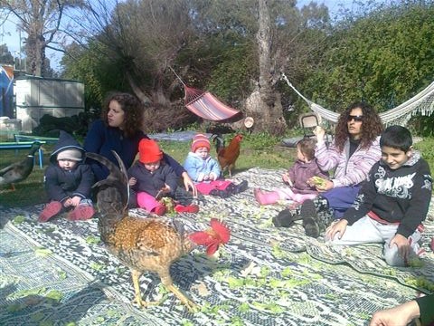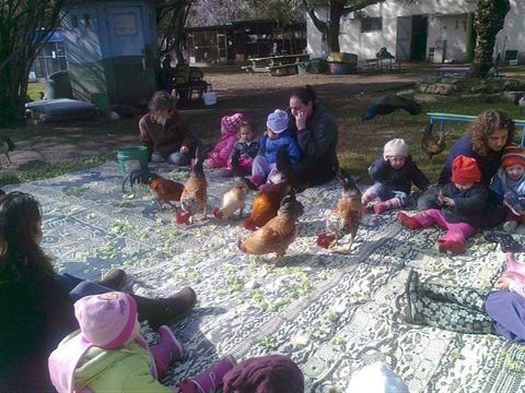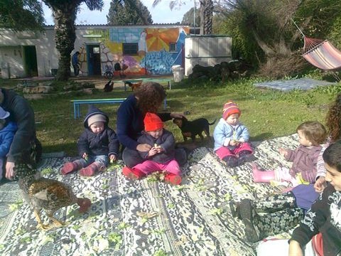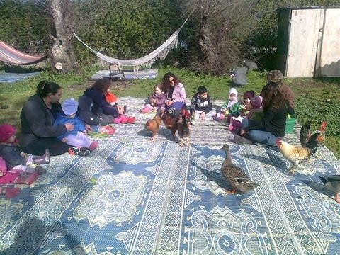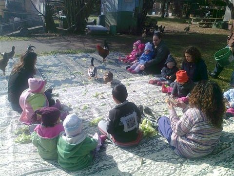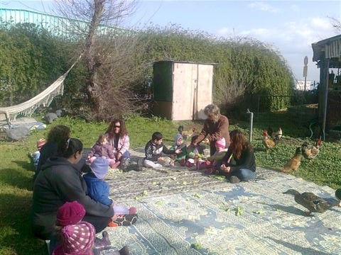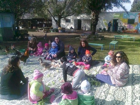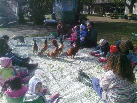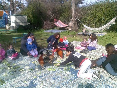 הפעוטות מפעוטון תות מאכילים בלחם ובירק את התרנגולות