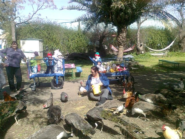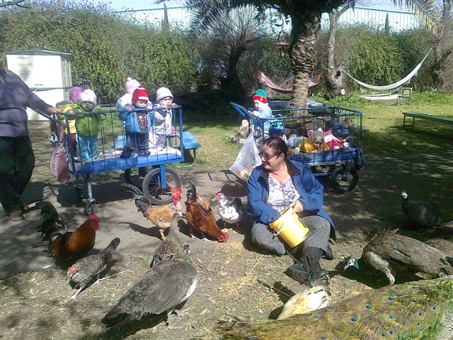 בית תינוקות ניצנים מתבוננים איך פלור מאכילה את התרנגולות, הטווסים, הפניניות והברווזים