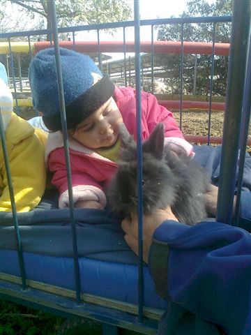שתי תמונות של התינוקת מיקה ירון מלטפת ארנב. גם בית תינוקות בא לבקר אותנו פעם בשבוע.