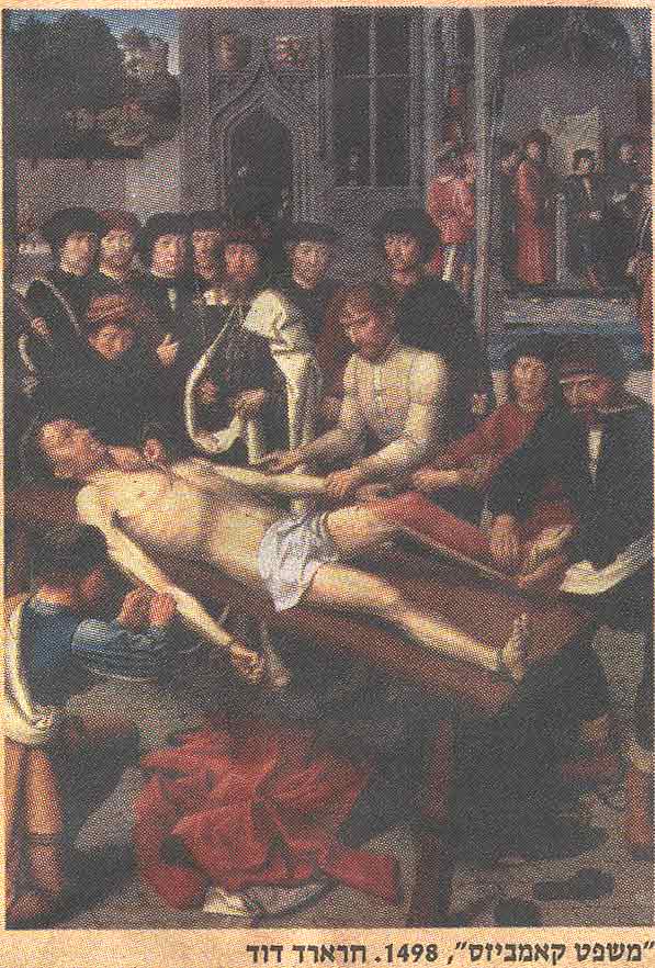על התמונה שלעיל הוא כותב: "אחד הציורים המזוויעים ביותר בקלאסיקה המערבית הוא "משפט קאמביזס" של חרארד דוד הפלמי, התלוי בבריז'. הציור מורכב משני פנלים, בראשון רואים את סיסאמנס, השופט המושחת, נעצר על ידיד שליחי המלך הפרסי הצדיק קאמביזס. השני מתאר, בריאליזם פלמי מקפיא דם, מה שנראה כעוד התכנסות בכיכר העיר. עד שמתבוננים במקרוב: במרכז התמונה שוכב סיסאמנס האומלל שנמצא בעיצומה של פשיטת עור. תרתי משמע. בצד ימין של הציור, ליד רגלו שהעור כבר נפשט ממנה כמעט לחלוטין, עומד אחד מתלייניו ויש לו בעיה: העור לא מתקלף מסביב לעקב. כדי להתמודד עם קשה העור הזה, התליין אוחז את סכין הפשיטה בין שיניו ותופס בעור הסרבן בשתי ידיו. עכשיו אתה יודעה שהבעיה נפתרה. פניו של פושט העור הן דוגמה נהדרת להתמודדות המוקדמת עם הרוע: הוא לא קיים. האיש פשוט מוטרד בפרקטיקות של יישום הרוע. רוע, כמו צליבה, הוא עניין לבעלי מלאכה. אחד דופק מסמרים, שני פושט עור. מה העניין ?".